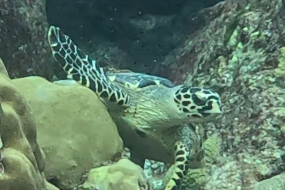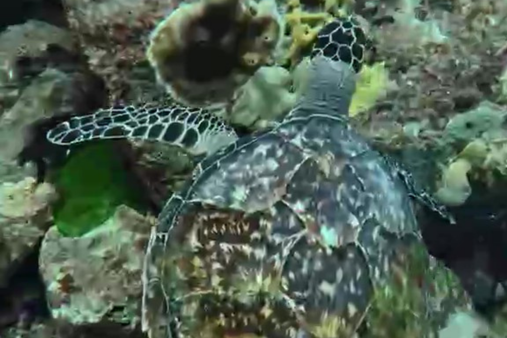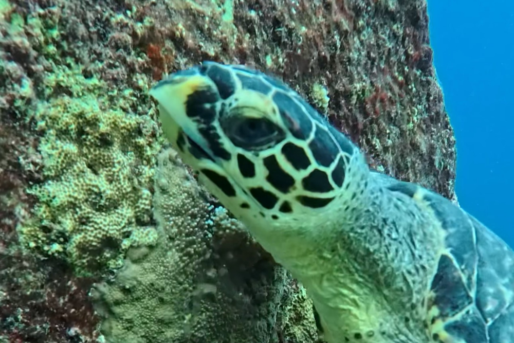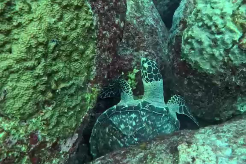 Sam and Pitt were diving together at Koh Tachai Reef during the Big Blue Diving Khao Lak × Andaman Turtle Watch special turtle-focused liveaboard when they came across Jueng nestled between the rocks. This sub-adult hawksbill may have been foraging or perhaps sheltering from the strong current that was pushing divers around that day.