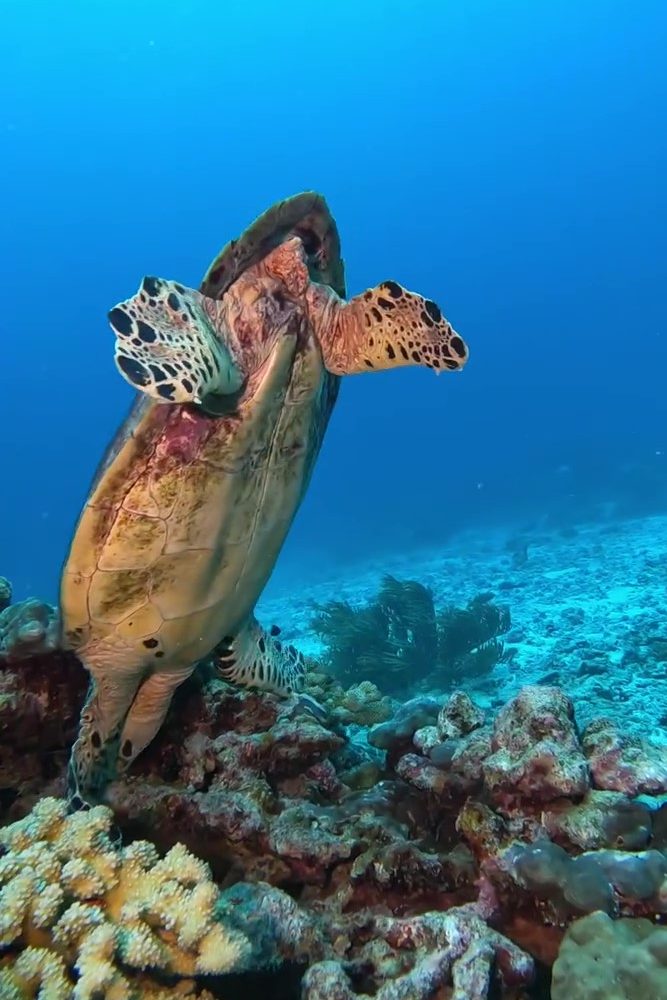 Minky is a sub-adult female hawksbill turtle first identified by Big Blue’s very own Pitt Pitchayanan, who kindly passed on the naming rights to the family that shared this magical encounter with her. True to her reputation, Pitt described Minky as being “a little greedy” during that first sighting – and it’s not hard to see why! Minky was so determined to reach her next meal that the strong current at Three Trees flipped her completely upside down and over, making for some very entertaining viewing. This unusual moment also gave us a perfect look at her plastron and tail (or lack thereof), which, combined with her size, confirms that Minky is indeed a female hawksbill.