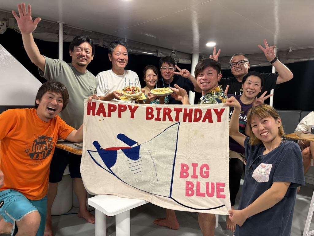 Best wishes to Takeshi, Takeshi and Teruaki. Thank you for sharing your birthday and dive anniversary celebrations with us, another great evening on the boat.
