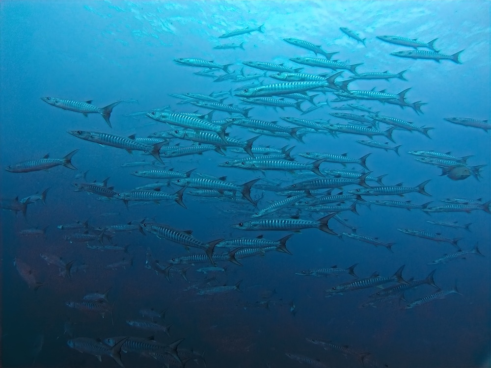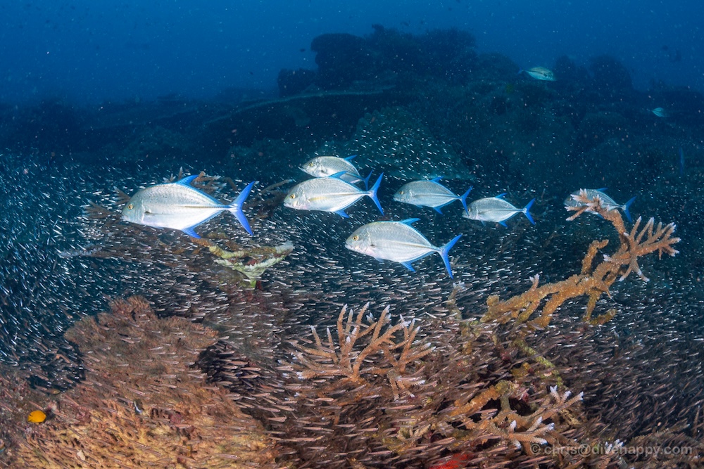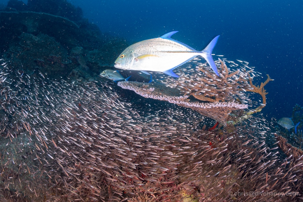 We enjoyed two fantastic dives—classic Richelieu at its best. Clouds of glassfish lit up in the sunlight while trevallies swept through in coordinated bursts. We found ornate ghost pipefish, harlequin shrimp, and plenty of photogenic action for wide-angle shooters.
