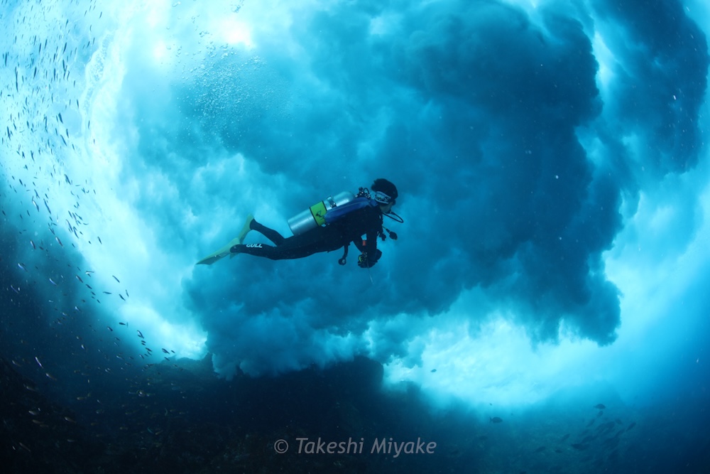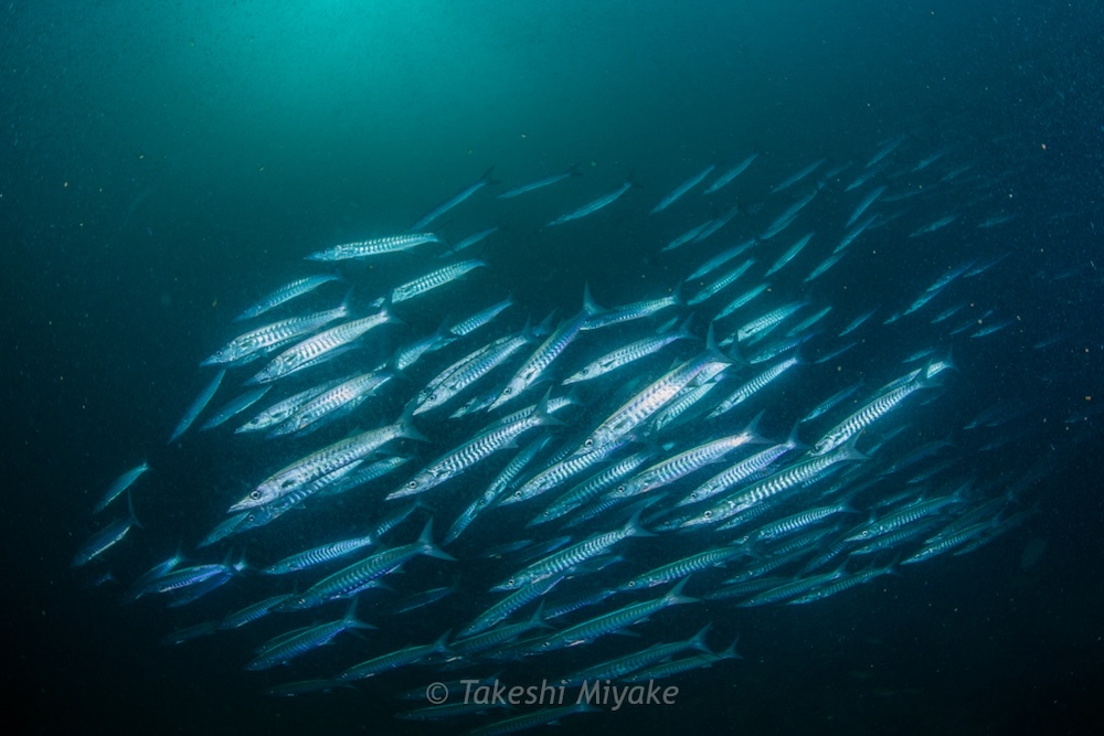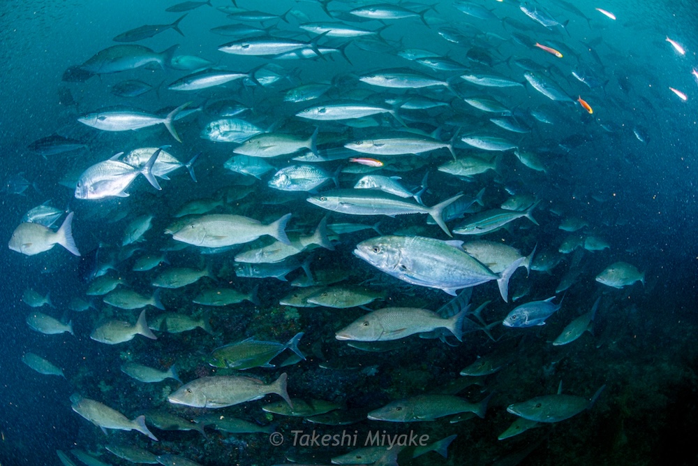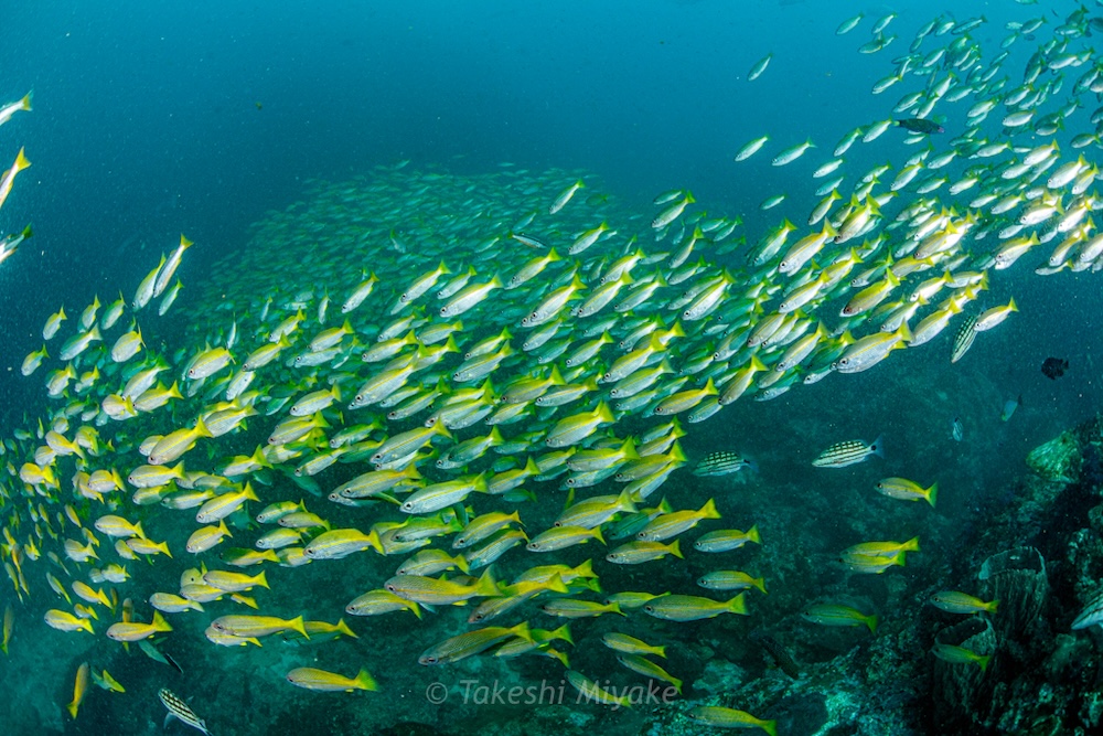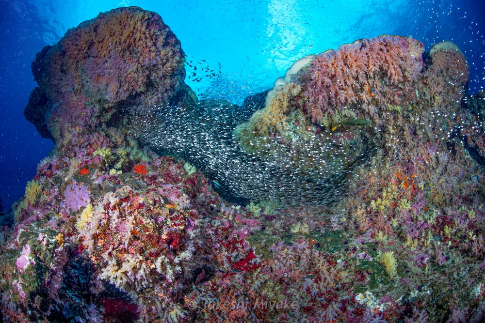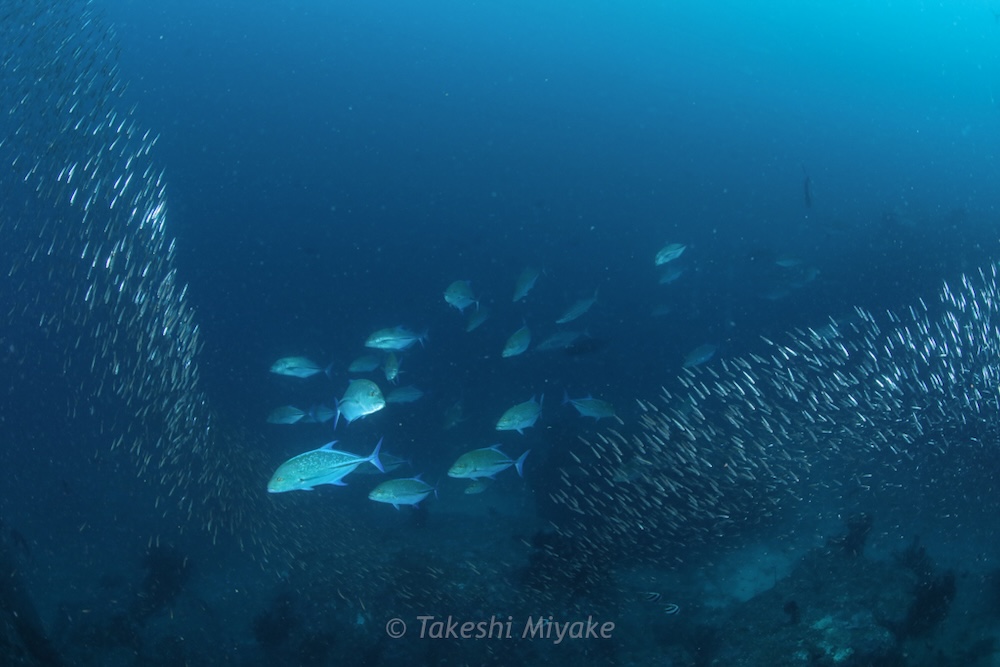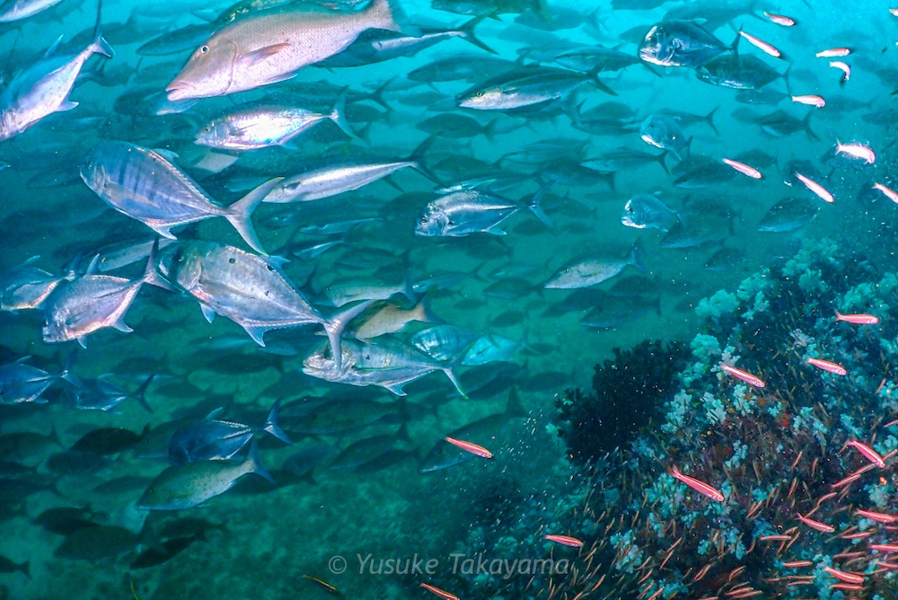 Schools of glassfish hugged the rock seeking protection from the surge, whilst huge schools of predators circled close by, extremely active. My divers were only a few metres away, but I lost them many times in the maelstrom of fish! It often went dark as massive schools swam overhead. When there was respite from all the action, octopus, cuttlefish, and some industrious harlequin shrimp entertained us too.